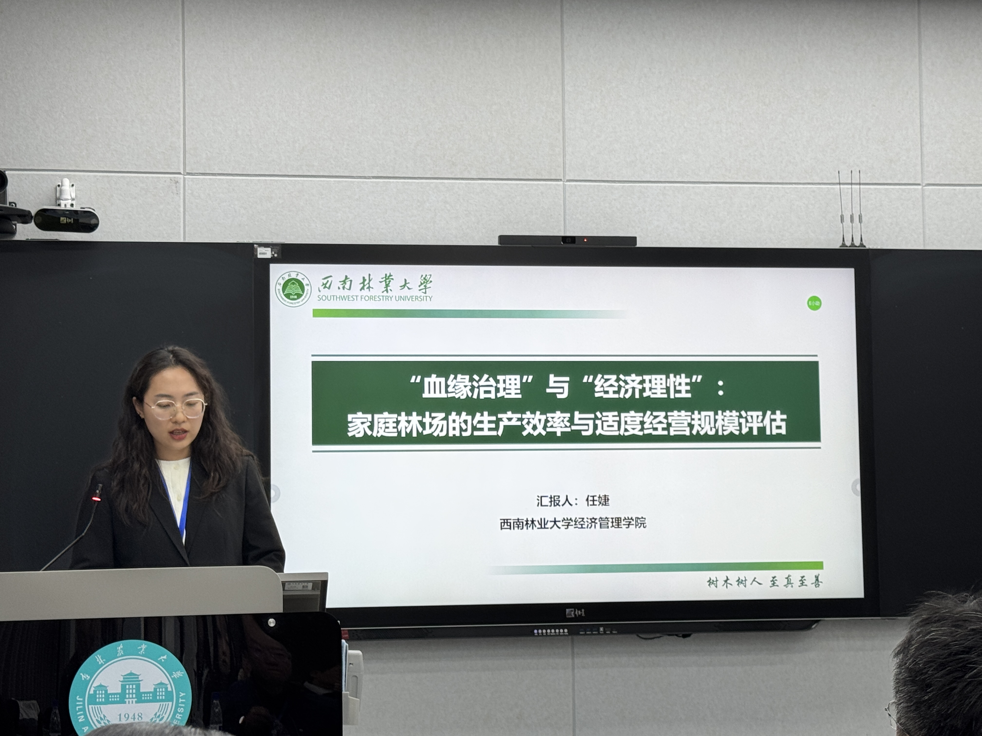 在林业经济与政策分会场上,任婕老师以《“血缘治理”与“经济理性”:家庭林场的生产效率与适度经营规模评估》为题,从社会学与经济学交叉视角剖析了家庭林场经营模式的内在机制,为乡村振兴背景下林业经营模式优化提供了理论支撑,引发与会学者热烈讨论。在林下经济分会场中,硕士研究生杨选琴则聚焦区域特色产业,做题为《云南省保山市林下中药材种植成本收益分析》的报告,为西南地区林下经济发展提供了实践参考。参会期间,我院师生积极与北京林业大学、东北林业大学等高校的科研团队就林业碳汇、生态产品价值实现等热点议题展开深入探讨。
