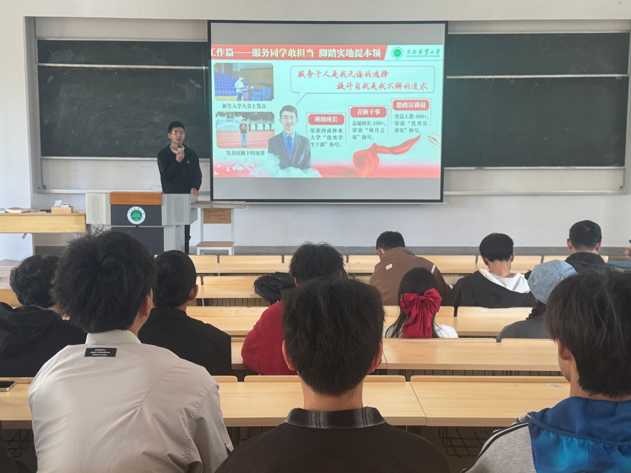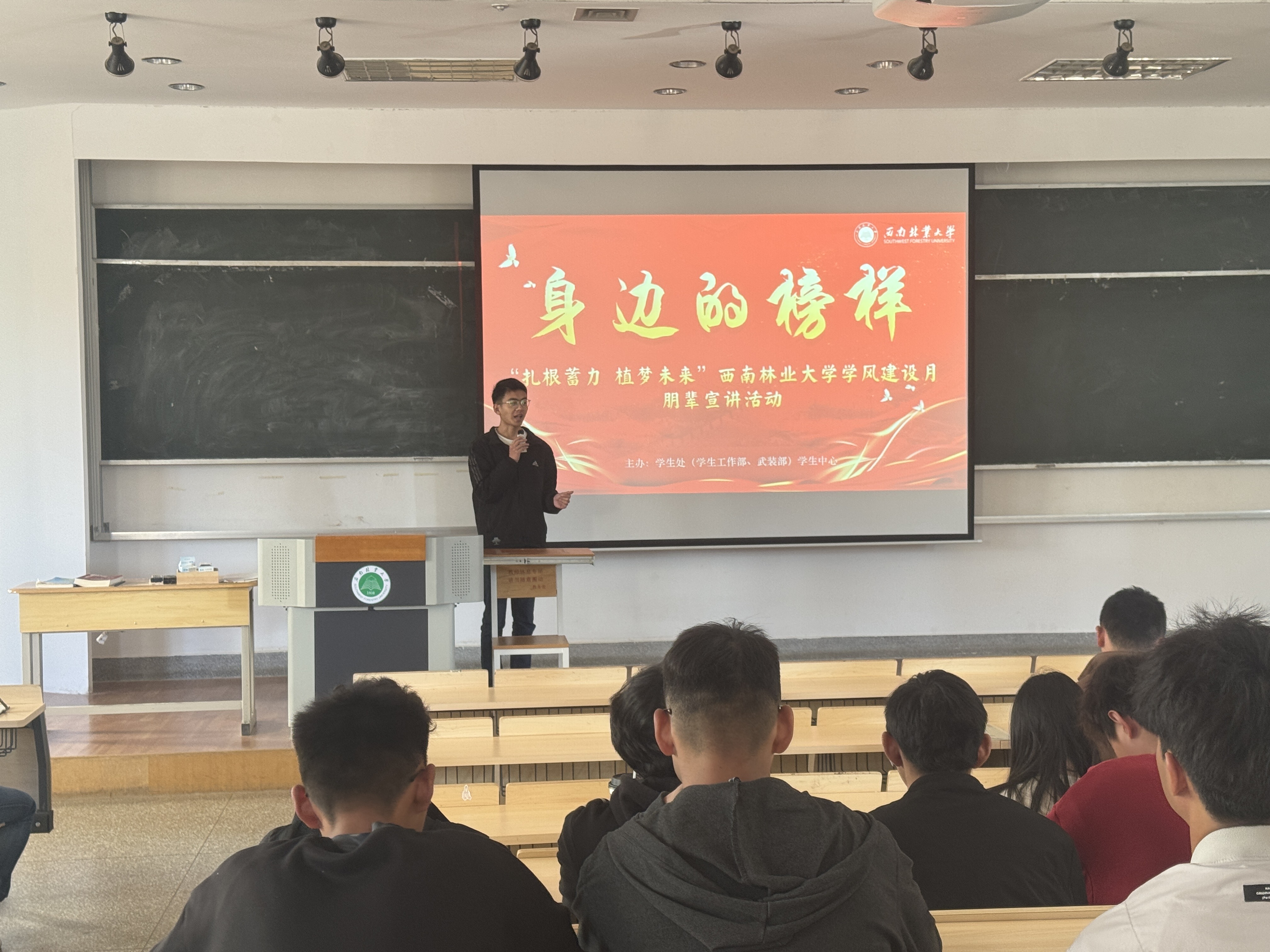 12月25日下午,西南林业大学2024学年大学生年度人物王荣锋同学走入经济管理学院2023级旅游管理2班开展了“身边的榜样”朋辈宣讲活动,分享他的成长历程与奋斗心路,激励广大青年学子向上“砥砺前行”。