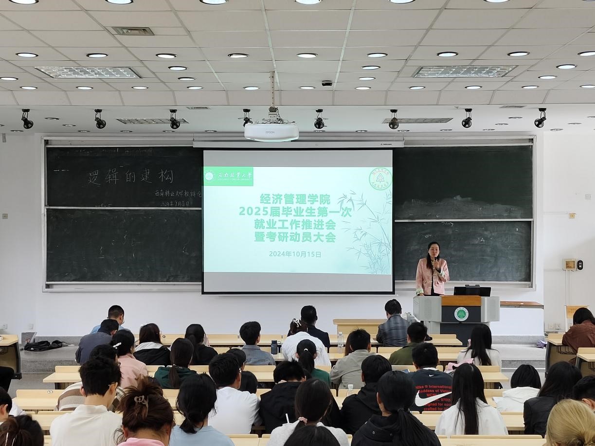 2024年10月15日,经济管理学院召开2025届毕业生第一次就业工作推进会暨考研动员大会,韩洁书记、张连刚院长、马泽副书记、李谦副院长、李娅副院长、2025届本科毕业班班主任及2025届有考研意愿的毕业生出席此次大会。