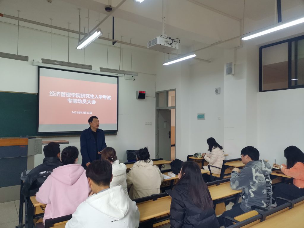 按照学校《关于做好2022年全国硕士研究生招生考试相关宣传教育的通知》要求,经济管理学院于2021年12月21日在第四教学楼302召开了2022年研究生入学考试的动员会。学院副院长邹再进、就业工作负责人李芸典、2022年研究生入学考试考生参加了会议。
