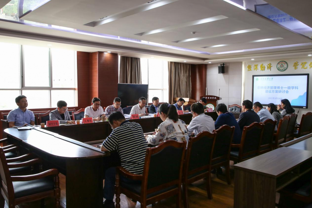 9月24日下午,农林经济管理博士一级学科建设方案研讨会在经管楼521会议室成功召开。郭辉军校长、彭志远副校长、杨斌副校长,发展规划处、科技处、社科办、人事处、研究生院等相关职能部门负责人,经济管理学院领导班子以及农林经济管理学科骨干教师出席了本次研讨会。会议由经济管理学院邹再进副院长主持。