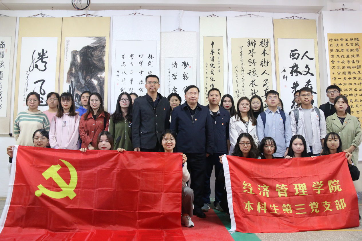 为进一步增强支部党员的“四个自信”,结合 “不忘初心、牢记使命”主题教育,经济管理学院本科生第三党支部于11月6日组织开展了“弘扬中国传统文化,提高美学修养”主题党日活动,参观了学校庆祝中华人民共和国成立70周年诗书画作品展,联系支部的校党委副书记彭志远、学院党委副书记刘俊伟、支部全体党员参加了本次活动。