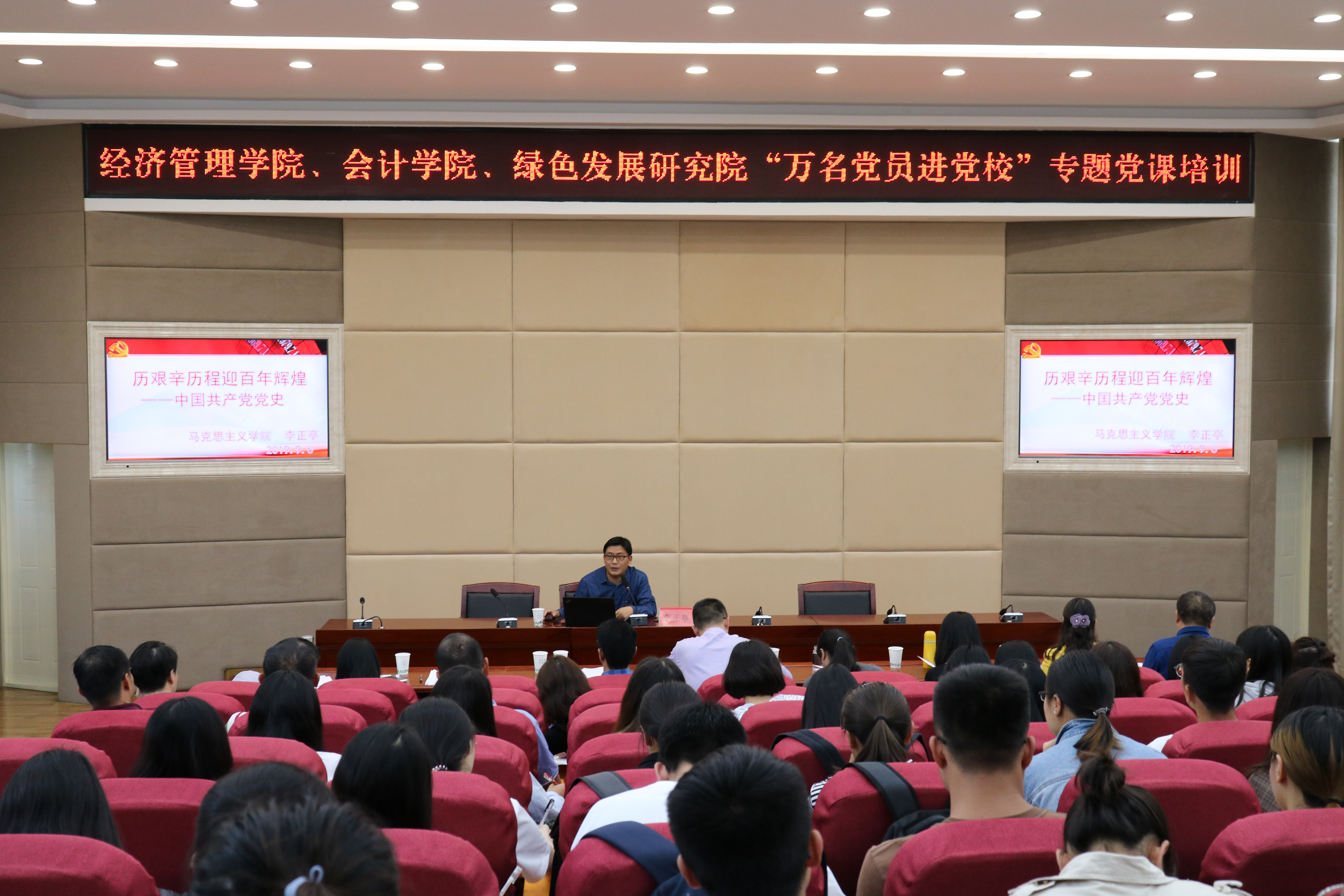 2019年9月6日下午,经济管理学院与绿色发展研究院分党校、会计学院分党校在双创园二楼报告厅举行联合举办了“不忘初心、牢记使命”主题教育暨 “万名党员进党校”专题党课培训。会议由会计学院党委副书记(主持工作)刘兴东同志主持,李正亭同志为全体党员讲授了以《历艰辛历程迎百年辉煌——中国共产党党史》为主题的专题党课。