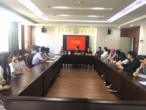4月24日上午11点,经济管理学院2019届毕业生代表座谈会在经管楼521会议室召开。经济管理学院党委副书记刘俊伟,学工办李政,辅导员张琴霞、李萍以及20名毕业生代表参加了此次座谈会。