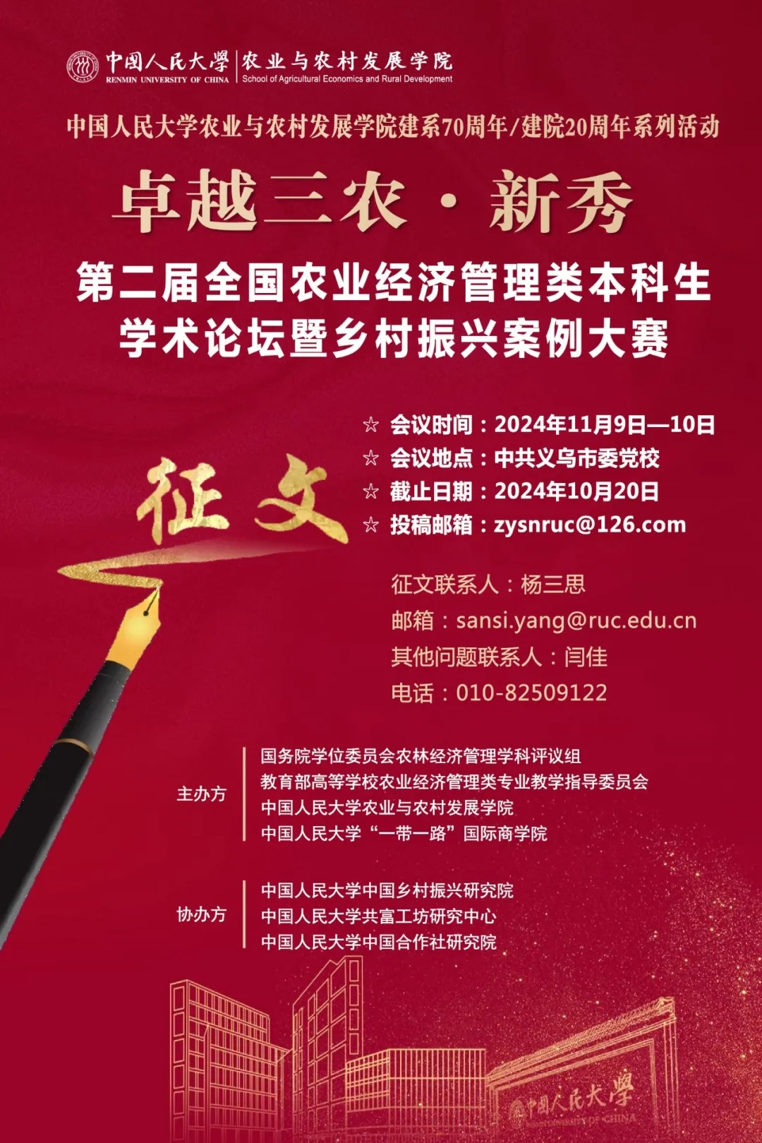 “卓越三农·新秀”全国农业经济管理类本科生学术论坛暨乡村振兴案例大赛是在教育部高等学校农业经济管理类专业教学指导委员会、国务院学位委员会农林经济管理学科评议组的指导下,由中国人民大学农业与农村发展学院主办的高端学术论坛,旨在为广大学子提供一个具有“三农特色”的学术交流平台。首届全国农业经济管理类本科生学术论坛暨乡村振兴案例大赛于2022年举办,吸引了来自全国36所高校的百余名本科生、研究生以及数十位评委专家参与,其中,12篇优秀论文、9篇优秀案例脱颖而出,获得表彰。为深入贯彻落实习近平总书记关于“三农”工作的重要论述和重要指示批示,宣传学习党的二十届三中全会和中央“一号文件”精神,第二届全国农业经济管理类本科生学术论坛暨乡村振兴案例大赛将于2024年11月初在浙江省义乌市举办。本届活动将设立多个主题专场,届时将邀请国内外知名专家学者担任评委,对参赛作品进行点评和讨论。其中,学术论坛重点面向本科生,旨在培养和鼓励本科生就农林经济管理学科领域发展前沿热点问题进行学术报告;案例大赛同时面向本科生和研究生,以实践问题为导向、以案例分析为形式,旨在引导本学科学生聚焦“三农”现实,通过实地调研、访谈等把论文写在祖国大地上,形成高质量的案例作品。两者均采用现场汇报的形式进行交流分享,由专家评委点评讨论后遴选出若干优秀论文及优秀案例。