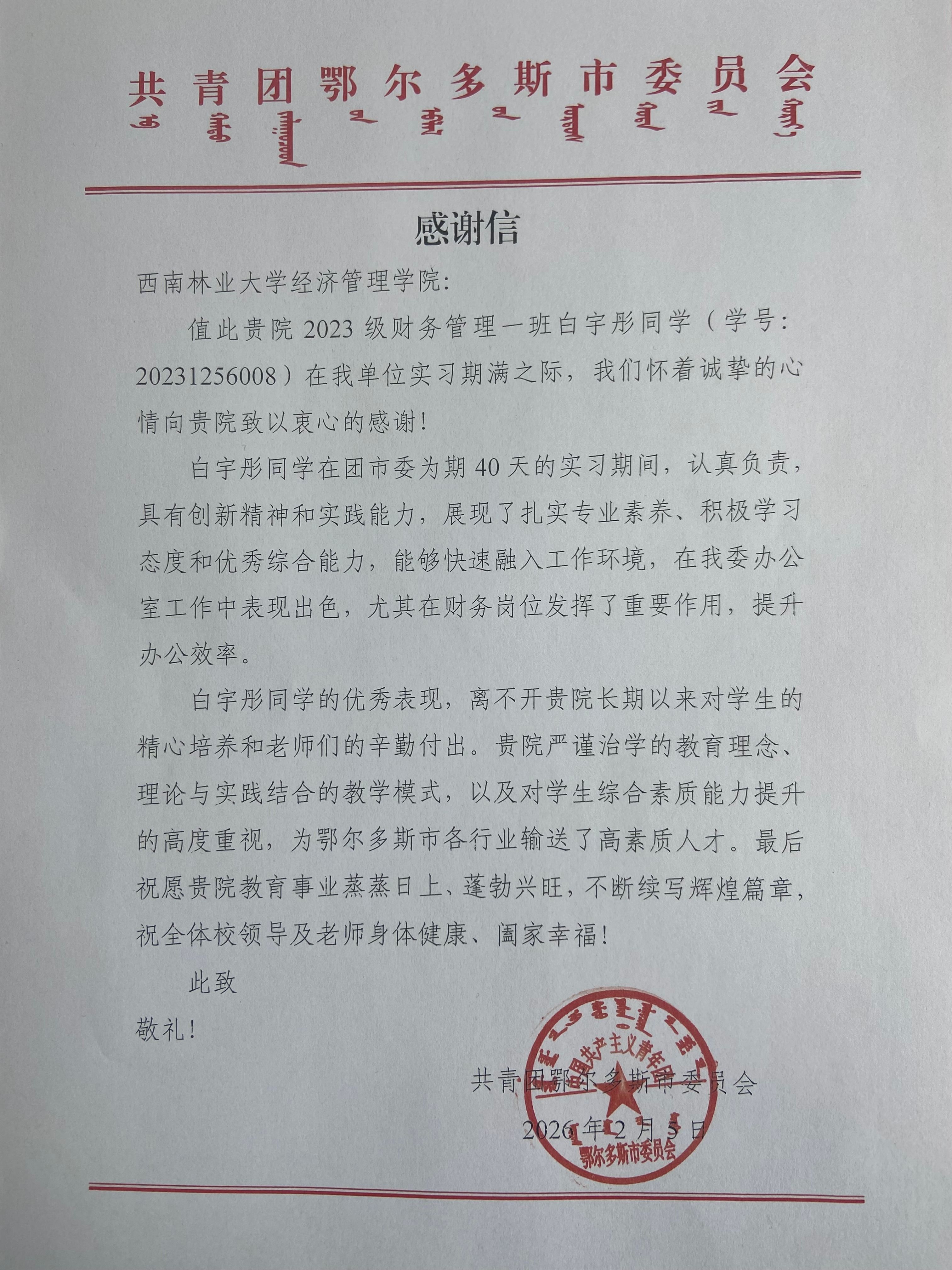 在鄂尔多斯市团委办公室财务岗位为期 40 天的实习中,白宇彤同学认真负责、勤于学习、善于创新,快速适应岗位要求,在财务相关工作中发挥重要作用,有效提升办公效率,展现出扎实的专业素养与优秀的综合能力,得到单位领导和同事一致认可。鄂尔多斯市团委在信中表示,学生的优秀表现,离不开学院长期以来严谨治学的教育理念、高度重视学生综合素质培养、坚持理论联系实际的教学模式,为地方输送了高素质应用型人才。