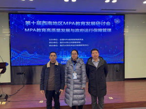 12月23日,我校经济管理学院副院长兼MPA教育中心主任邹再进、MPA教育中心副主任刘会柏以及研究生教学秘书张琴霞一行三人到重庆大学参加了第十届西南地区MPA教育发展研讨会。