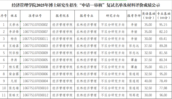 根据《西南林业大学2025年博士研究生招生简章》、《西南林业大学2025年博士研究生招生管理办法》和《经济管理学院2025年博士研究生招生实施细则》相关规定,经济管理学院对通过形式审查的11名考生开展了材料评价,现将材料评价成绩及复试名单公示如下: